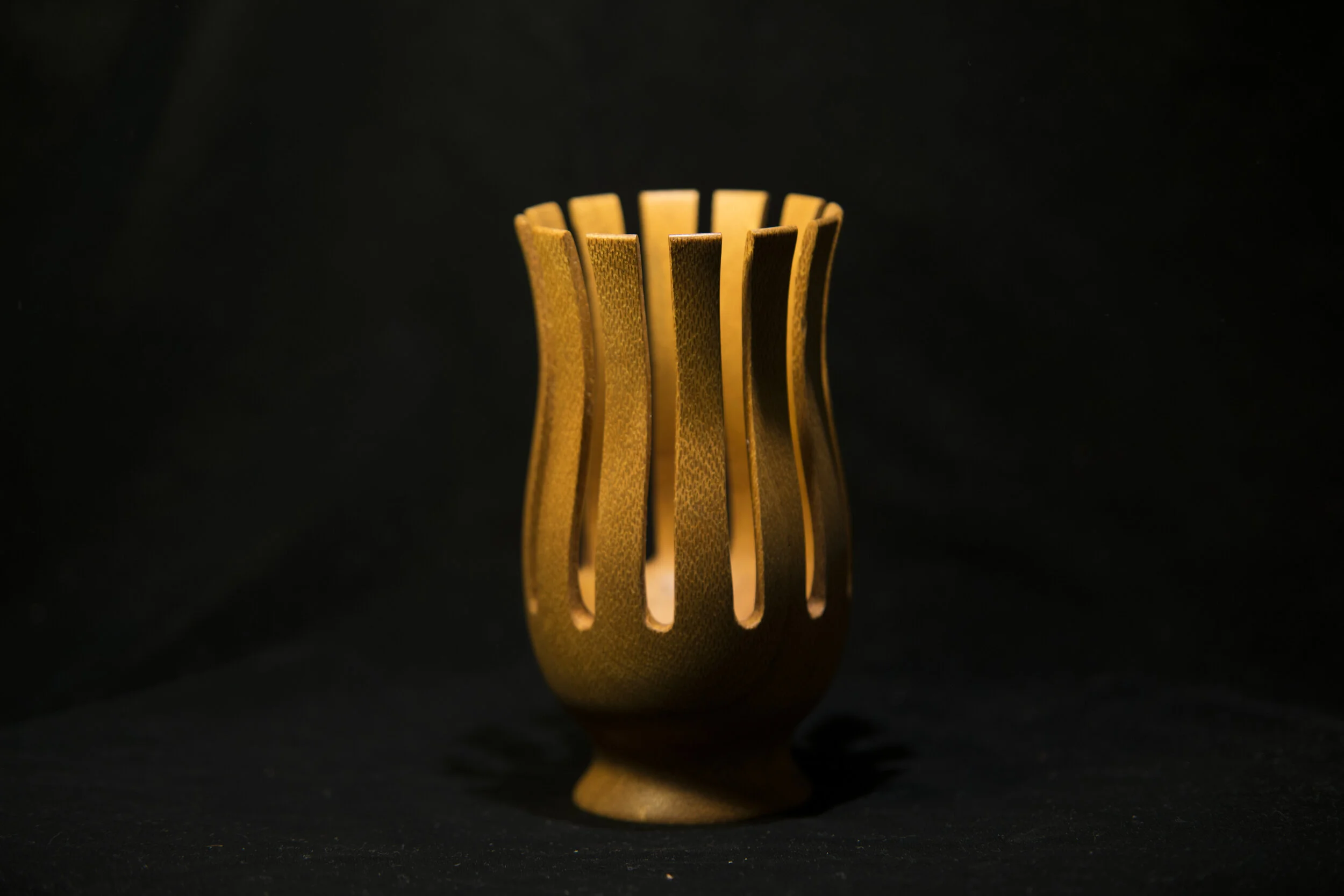 Seed pod-like ornate vase centre contrasted by smooth, outer ‘shell’.